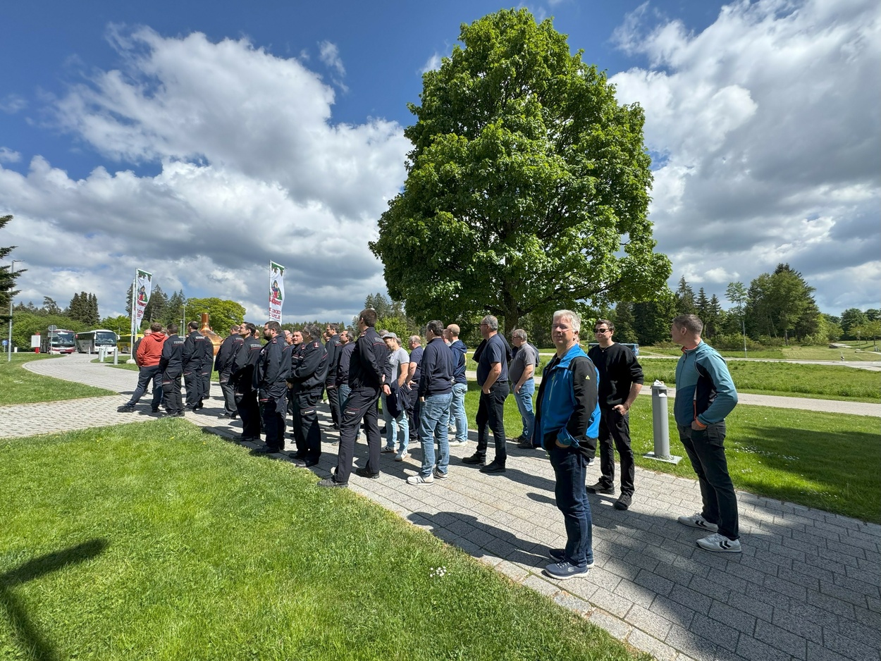 Gegen 15 Uhr schlüpfte das Plenum in Zivilkleidung und machte sich mit zwei Bussen auf den Weg ins etwa 20 Kilometer entfernte Rothaus. In der dortigen Staatsbrauerei wartete ein fachbezogenes Rahmenprogramm auf die Teilnehmer, bei dem vor allem der gegenseitige Austausch aller im Vordergrund stand. Tatsächlich gab es beim Seminar 2025 so viele neue Gesichter kennenzulernen, wie wohl noch niemals zuvor: Seit dem letzten mehrtägigen Seminar im Jahr 2019 bzw. 2016 sind etwa zwei Dutzend Kommandanten und Stellvertreter aus ihren Ämtern ausgeschieden und neue an deren Stelle getreten. Aber man kam auch mit vielen Altbekannten ins Gespräch. Natürlich fachsimpelte man auch über das betont naturbelassene und sehr bekannte „Produkt“ aus Rothaus und konnte dieses in den Produktionshallen und später auch im „Zäpfle Markt“ verkosten.